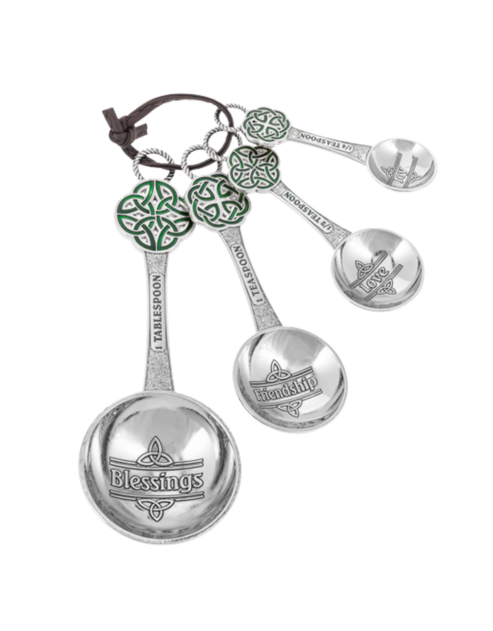This set of 4 measuring spoons is crafted of silver-tone base metal, and features Celtic knots, green enamel and silver sparkles. Each spoon measures out varying amounts and features nice words to brighten your day. Trinity knots adorn the words on either side. The smallest spoon reads “Joy” and measures 1/4” of a teaspoon. The next spoon reads “Love” and measures 1/2” of a teaspoon. The third spoon reads “Friendship” and measures 1 teaspoon. The largest of the spoons reads “Blessings” and measures 1 tablespoon. The set, when stacked, measures approx 5.5”L x 2”W. It comes tied with a leather-like string. The spoons are fully decorated, from the measurements, words and Celtic knots on the front to a beautiful 4-trinity design on the back of each spoon.